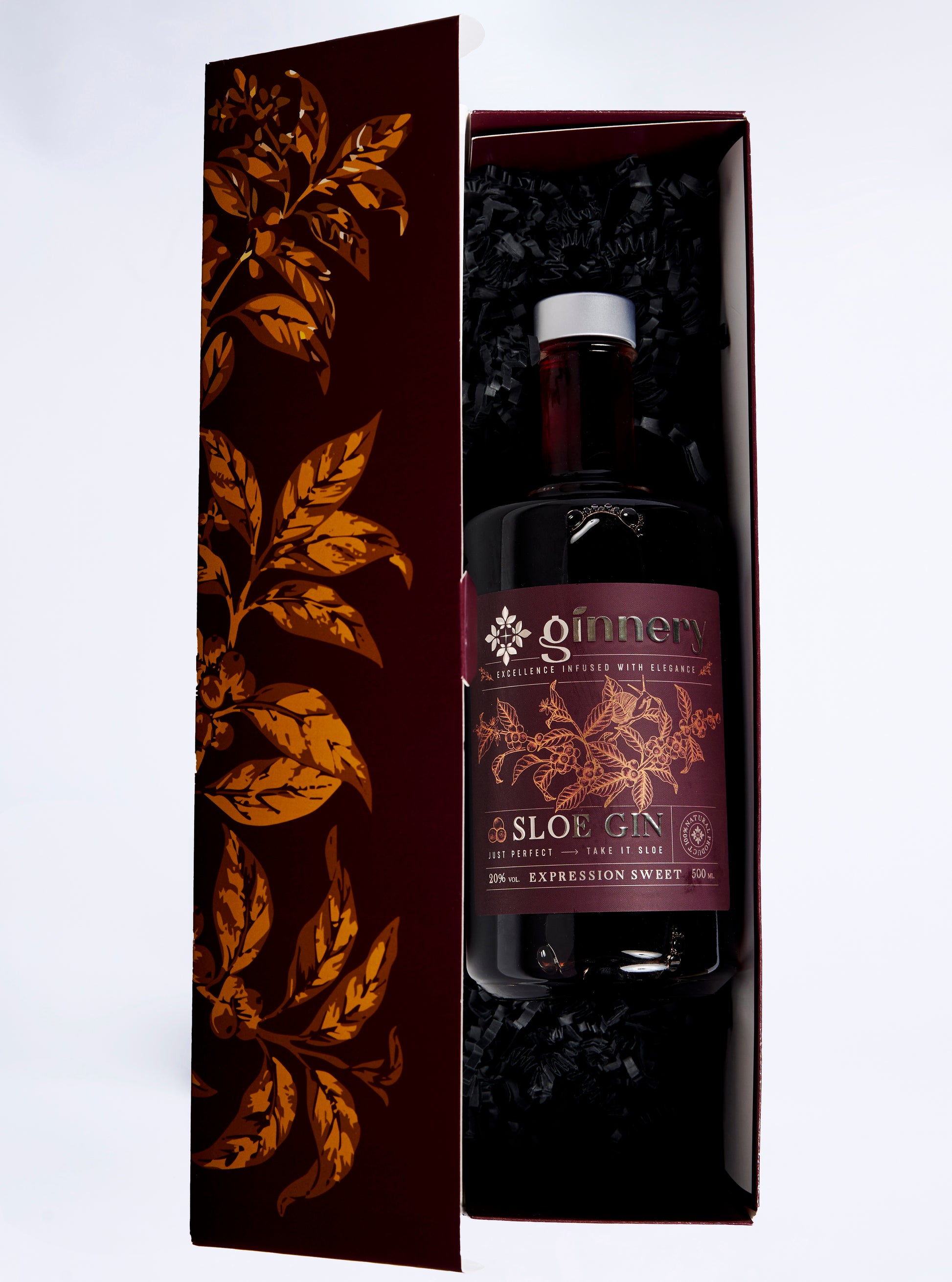 Wykończony w głębokim burgundowym odcieniu, z roślinnymi detalami inspirowanymi tarniną, idealnie podkreśla ciemny, aksamitny charakter likieru. Wnętrze z dopasowaną strukturą stabilizuje butelkę i sprawia, że zestaw jest gotowy do wręczenia — bez konieczności dodatkowego pakowania.